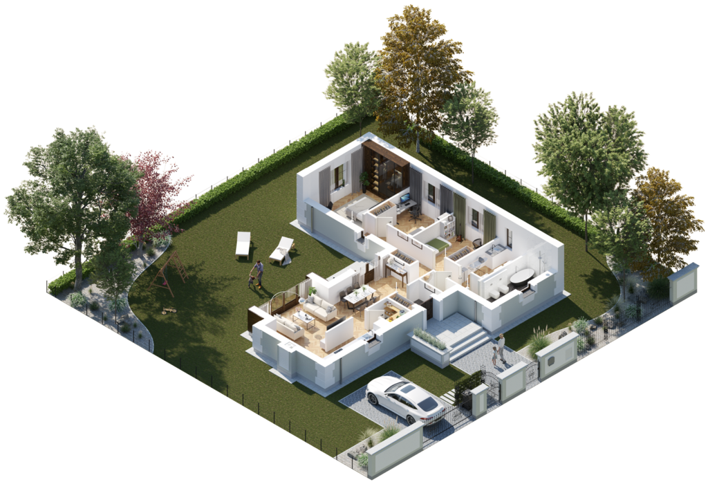 The house for a family with three children. It has a living room opened to the kitchen and dining room, the master bedroom and three other rooms.
